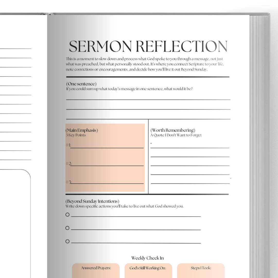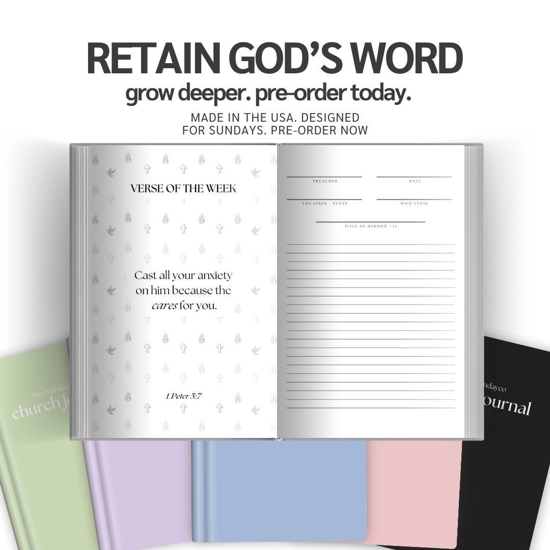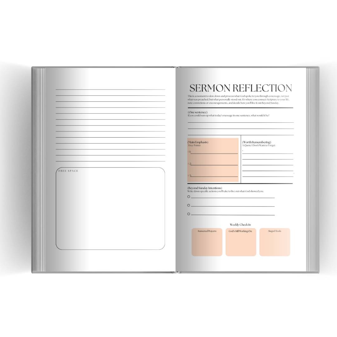 The Beyond Sunday Service Journal helps you capture every sermon, revelation, and prayer so you can revisit and reflect throughout the week. With 26 weeks of Sunday entries, a clean modern design, and durable U.S. made quality. It’s your weekly companion for building a deeper, consistent walk with God.
